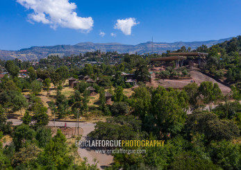 Protective shelters over a monolithic rock-cut church, Amhara region, Lalibela, Ethiopia