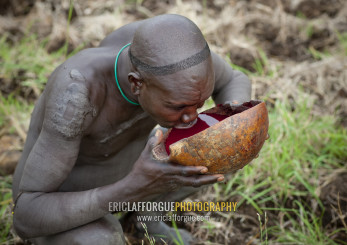 Suri Man Drinking Fresh Cow Blood, Turgit Village, Omo Valley, Ethiopia