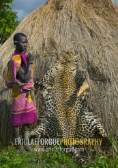 Suri woman posing near an animal skin, Tulgit, Omo valley, Ethiopia