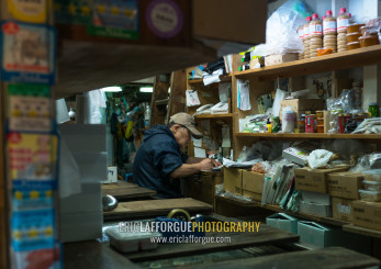 Vendor in Tsukiji fish market, Kanto region, Tokyo, Japan