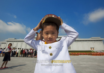 North Korean boy in army uniform putting his kepi in Grand monument of Mansu hill, Pyongan Province, Pyongyang, North Korea