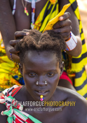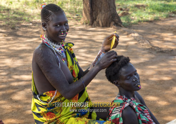 Larim tribe woman making braids to a friend, Boya Mountains, Imatong, South Sudan