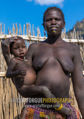 Larim tribe woman carrying her baby in front of a fence, Boya Mountains, Imatong, South Sudan