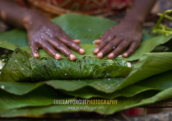 Woman cooking a bougna in a green banana leaf, Tanna island, Epai, Vanuatu