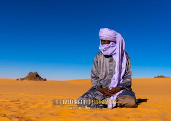 Tuareg sit in the Sahara desert, North Africa, Erg Admer, Algeria
