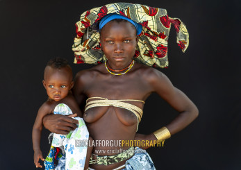 Mucubal tribe woman holding her baby, Namibe Province, Virei, Angola