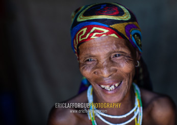 San tribe woman smiling portrait, Huila Province, Chibia, Angola