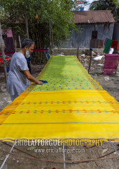 Bangladeshi man putting wax on fabric, Dhaka Division, Rupganj, Bangladesh