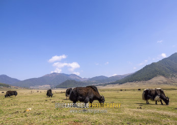 Yaks grazing in a meadow, Wangdue Phodrang, Phobjikha Valley, Bhutan