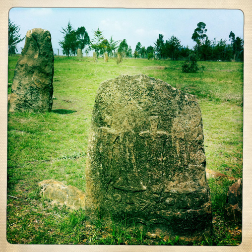 Carved headrest and dagger in the site of tiya, Unesco world heritage site, Tiya, Ethiopia