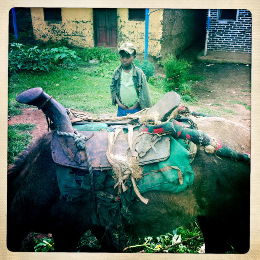 Young Boy With Green Bananas Bunch On His Head Ethiopia