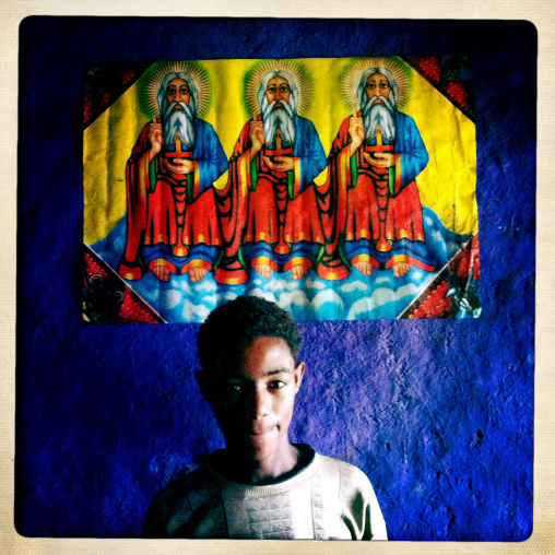 Family sit in a house decorated with christian posters, Gamo Gofa Zone, Ganta, Ethiopia