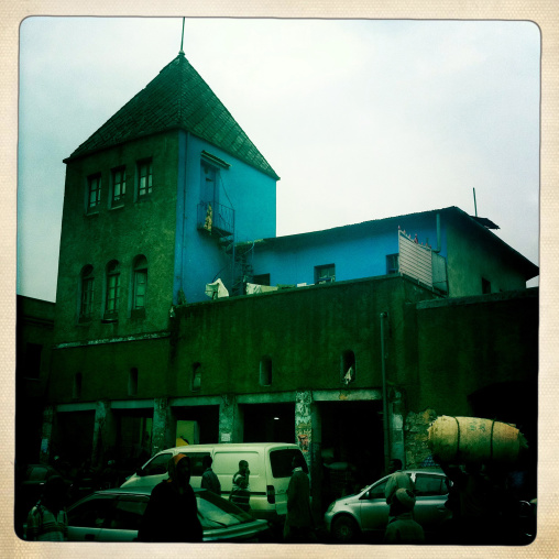 Man resting in a blue painted hotel in omorate, Ethiopia