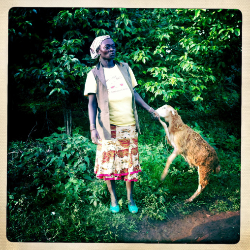 Shy Oromo Tribe Boy Holding A Kid Goat In His Arms, Adama, Ethiopia
