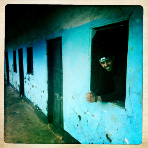Ethiopia, Kembata, Alaba Kuito, ethiopian boy inside his traditional painted and decorated house