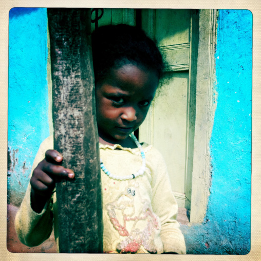 Physically and mentally handicapped child chained to a fence in a house, Kembata, Alaba kuito, Ethiopia