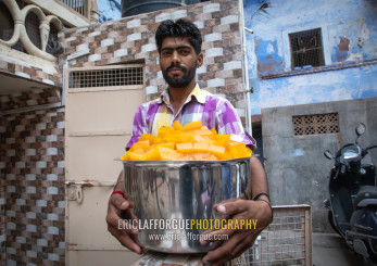 Indian man carrying food in the street, Rajasthan, Jodhpur, India