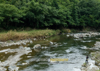 Japanese man fishing in a river, Kyoto Prefecture, Miyama, Japan