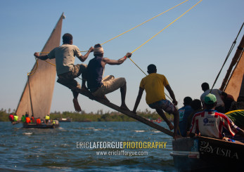 Man balancing dhow while sailing, Lamu County, Lamu, Kenya