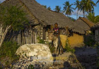 Child riding a donkey, Lamu county, Matondoni, Kenya