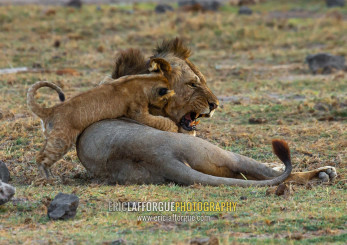 Lion cub playing with his father, Kajiado County, Amboseli, Kenya