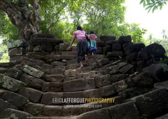 People climbing stairs at wat phu khmer temple, Champasak, Laos