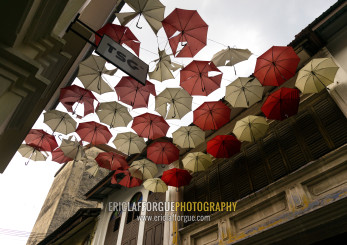 Red And White Umbrellas Above Street, Perak State, Ipoh, Malaysia