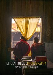Novices Monks Looking Thru A Window, Inle Lake, Myanmar