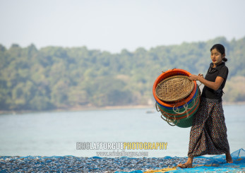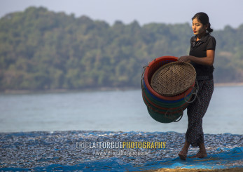 Woman Putting Dried Fish On The Floor, Ngapali, Myanmar