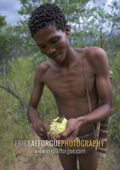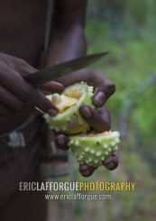 Bushman Cutting An Oryx Cucumber, Tsumkwe, Namibia