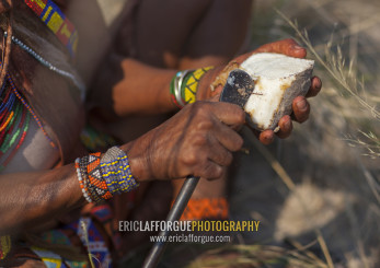Bushman Cutting A Tuber To Drink The Liquid, Tsumkwe, Namibia