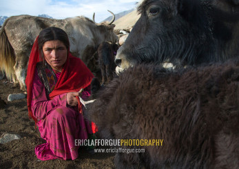 Wakhi nomad woman milking a yak, Big pamir, Wakhan, Afghanistan