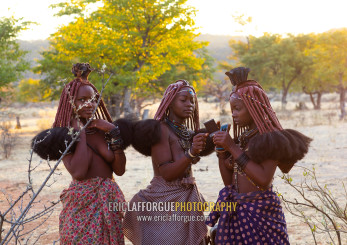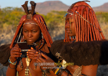 Himba tribe women looking at polaroids, Cunene Province, Oncocua, Angola
