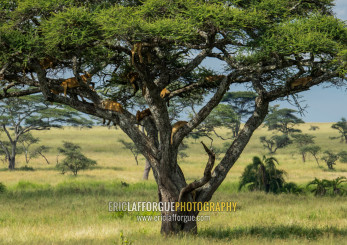 Tanzania, Mara, Serengeti National Park, tree-climbing lions sleeping on branches