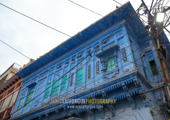 Old blue house balcony of a brahmin, Rajasthan, Jodhpur, India