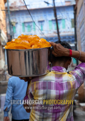 Indian man carrying food in the street, Rajasthan, Jodhpur, India