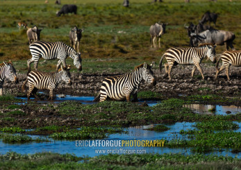 Zebras and wildebeests in a swamp, Kajiado County, Amboseli, Kenya