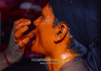 Make up of a Hindu devotee covered with orange color at Lal Kach festival, Dhaka Division, Munshiganj Sadar, Bangladesh