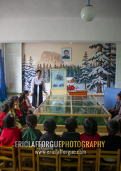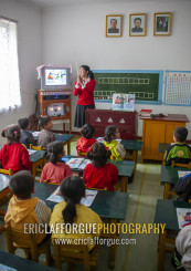 Pupils with a teacher in a classroom, South Pyongan, Chongsan-ri Cooperative Farm, North Korea