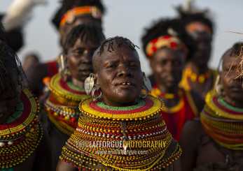 Turkana tribe women with huge necklaces, Turkana lake, Loiyangalani, Kenya