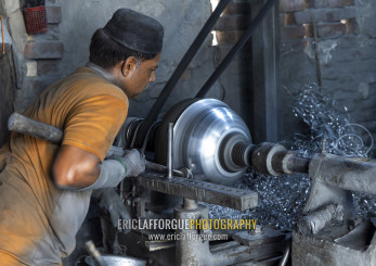 Bangladeshi worker making metal bowls, Dhaka Division, Dhaka, Bangladesh