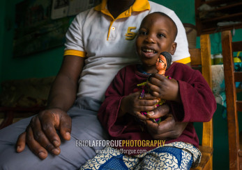 Benin, West Africa, Ouidah, eric and his son paterne with the carved wooden figure made to house the soul of their dead twin paterna