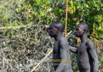 Suri tribe warriors during a donga stick fighting ritual, Omo valley, Kibish, Ethiopia