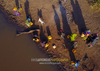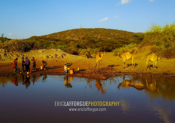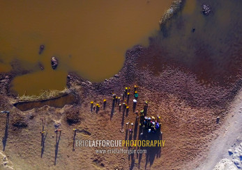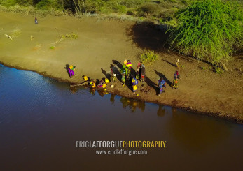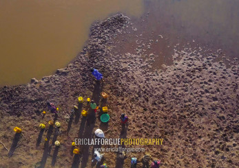 Aerial view of Borana tribe people filling jerricans in a water reservoir used for animals, Oromia, Yabelo, Ethiopia