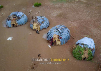 Aerial view of the village built for the dimi ceremony in the Dassanech tribe to celebrate circumcision of teenagers, Omo Valley, Omorate, Ethiopia