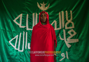Sufi woman worshipper in front of islamic green flag, Harari region, Harar, Ethiopia