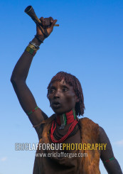 Hamer tribe woman dancing during a bull jumping ceremony, Omo valley, Turmi, Ethiopia