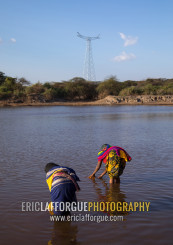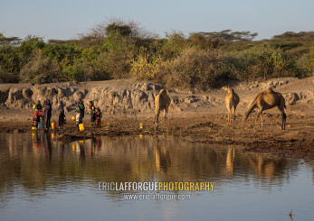 Borana tribe people filling jerricans in a water reservoir used for animals, Oromia, Yabelo, Ethiopia