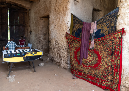 Ethiopian children playing baby foot under a gate, Harari Region, Harar, Ethiopia