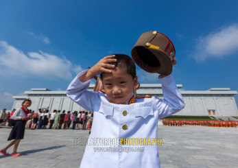 North Korean boy in army uniform putting his kepi in Grand monument of Mansu hill, Pyongan Province, Pyongyang, North Korea